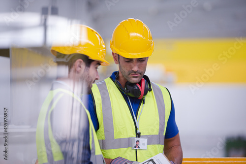 Supervisor and worker talking in steel factory