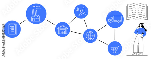 Supply chain from manufacturing, warehousing, distribution to consumer. Ideal for logistics, business strategy, distribution networks, global trade, supply chain management, transportation