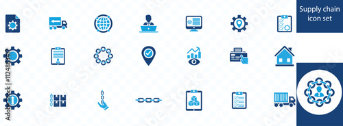 Supply chain icon set. Shipping, logistics, delivery, product, distribution, factory, warehouse, box, industry and shipment icons. Solid icon