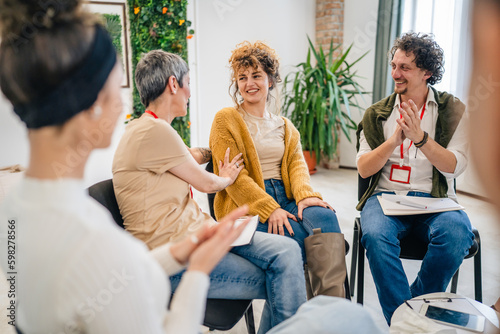 Support Group with Therapists and Woman in Focus solving problem