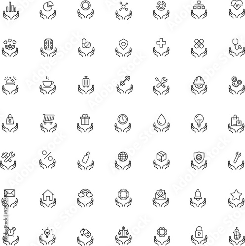 Support, present and charity concept. Modern vector signs drawn with black thin line. Editable stroke. Line icon set with various items over outstretched hands