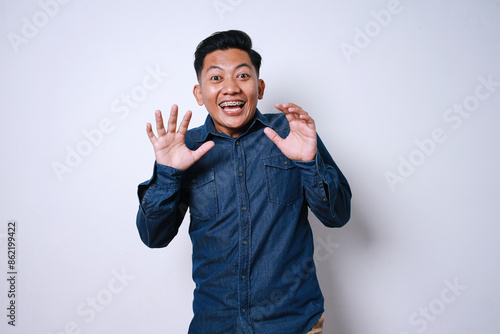 Suprised Asian Mature Guy With Braces Teeth Isolated On White Background
