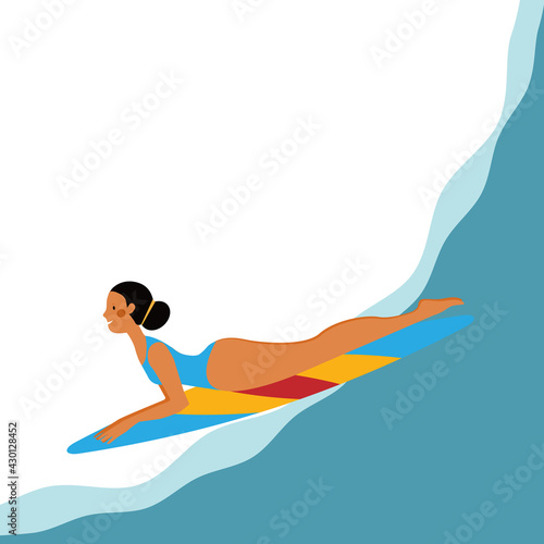 Surfer Girl In Action. Surfing girl on the surf board catching waves in the sea.