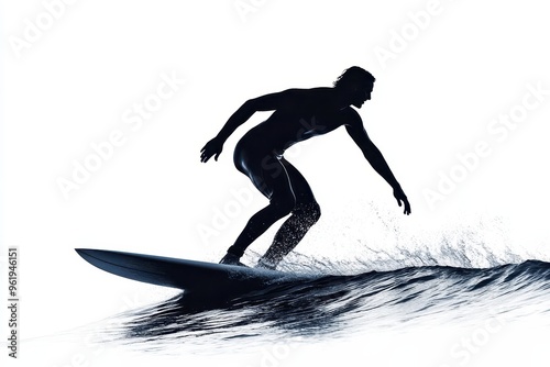 Surfer on surfboard in profile on white background