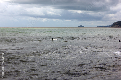 Surfing in corona times at Marina di Caarrara, Tuscany, Italy