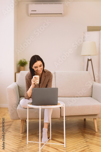 Surfing Internet. Happy smiling woman working on laptop computer, sitting on sofa, holding cup of coffee, copyspace