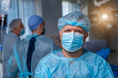 Surgeon in mask looking at camera. Doctor in surgery office. Team working on the background.