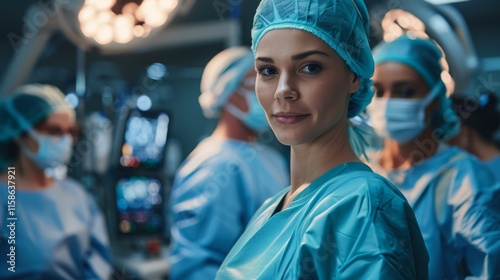 Surgeons working in an operating room during a complex medical procedure at a hospital in the evening