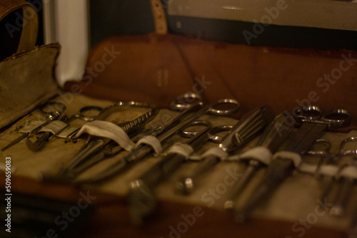 Surgical instruments covered with gauze. Lying on the table in the operating room