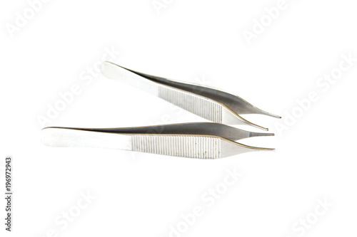 Surgical Instruments (tweezers, pliers, clamp the blade, scalpel, scissors) on a white table.