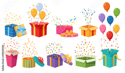 Surprise boxes with confetti. Sudden joy. Birthday celebration. Holiday gifts in decorative wrappers. Prize opening. Festive balloons. Anniversary party elements. Recent vector set