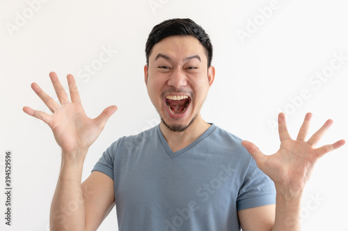 Surprised and wow face of Asian man in blue t-shirt on isolated background.