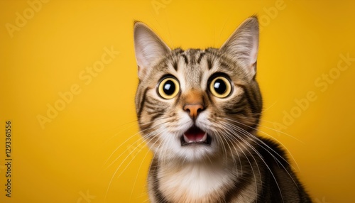 Surprised Cat in Yellow Background Vivid Portrait of a Curious Feline with Expressive Eyes and Isolated on a Bright Canvas