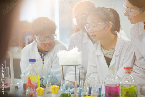 Surprised, curious students watching chemical reaction, conducting scientific experiment in laboratory classroom