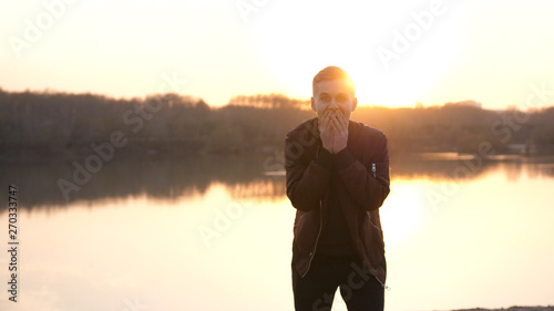 Surprised emotional man looking into the camera. Portrait of a handsome young guy on the beach during sunset