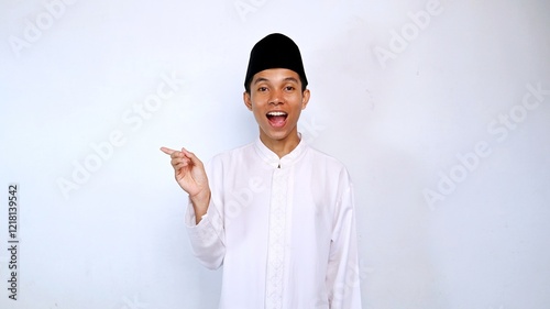 surprised expression of handsome young asian muslim hand gesture pointing sideways with isolated white background