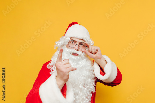 Surprised santa claus isolated on yellow background, looks at camera with shocked face and shows finger. Santa's surprise at Christmas