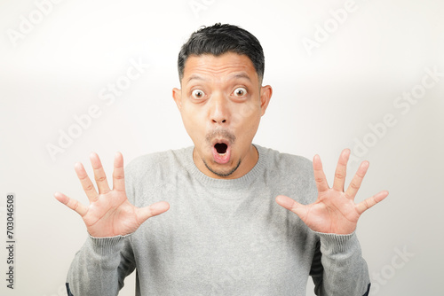 surprised, shocked expression of Asian Man with both fingers open, isolated background