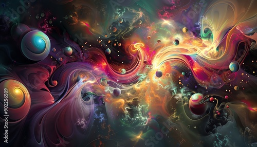 Surreal abstract art with colorful swirls and spheres, vibrant lighting, wideangle, imaginative and dreamy