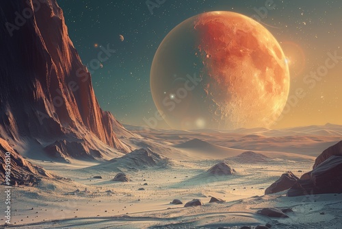 Surreal Alien Landscape with Mountains and Planet Under an Fantasy Sky