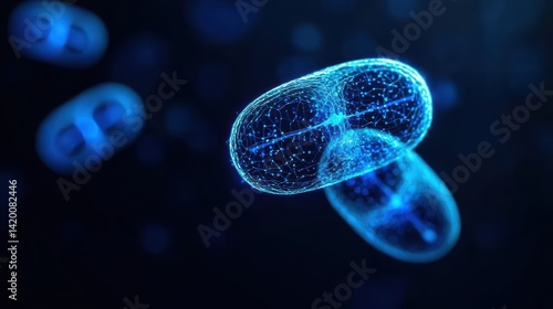 Surreal bioluminescent cell division scene, mitochondria glowing as they split apart
