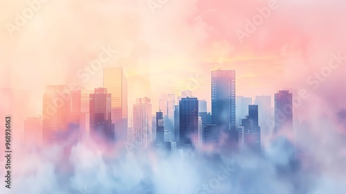 Surreal cityscape at dawn with high-rise buildings emerging from a soft, colorful mist, creating a dreamlike urban scene.