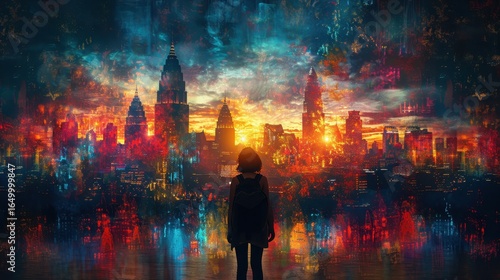 Surreal Cityscape at Sunset with Silhouette of Person