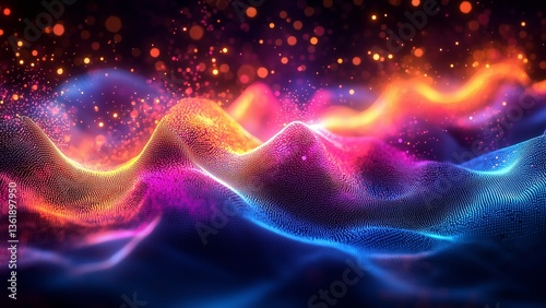 Surreal colorful soundwave visualization over water with glowing particles and light effects