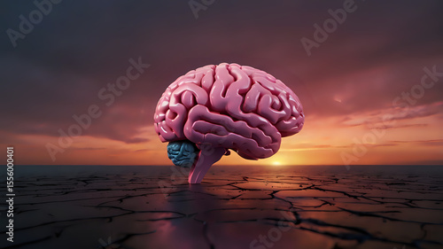 Surreal Conceptual Artwork of a Glossy Pink Human Brain on Cracked Earth with Digital Elements and Dramatic Lighting
