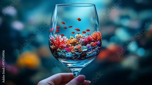 Surreal Contrast - Person Holding Empty Wine Glass Filled with Vibrant Coral Reef Imagery