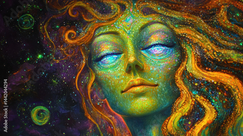 Surreal cosmic goddess with glowing skin and flowing multicolored hair amidst a vibrant galaxy and nebula background portraying fantasy celestial art scene