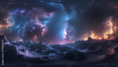 Surreal cosmic landscape with luminous nebula and misty terrain