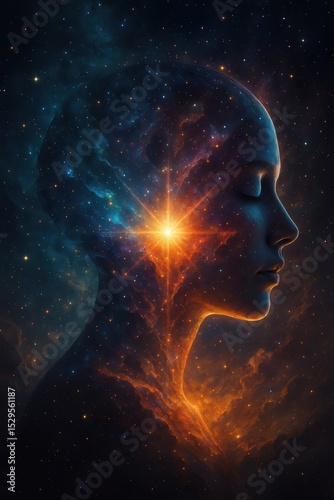 Surreal cosmic portrait of a woman with starlight radiating from her mind. AI-generated.