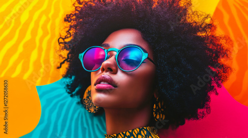 Surreal depiction of an afro woman with funky glasses in a colorful artistic landscape
