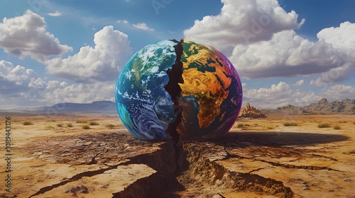 Surreal depiction of half vibrant and half cracked Earth, an artistic metaphor for environmental crises, enhancing the impact with dramatic color contrasts.