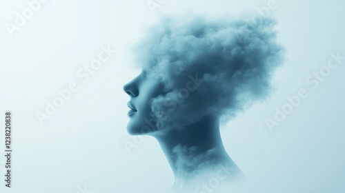 Surreal depiction of mental health, showcasing a figure with a cloud-like head, symbolizing thoughts and emotions blending into the atmosphere while representing inner turmoil and clarity