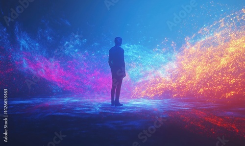 Surreal digital landscape with a silhouette standing amidst vibrant colors and light effects