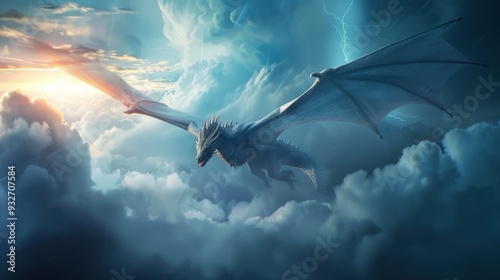 surreal flying dragon stormy sky lightning bolts ethereal wings mystical aura