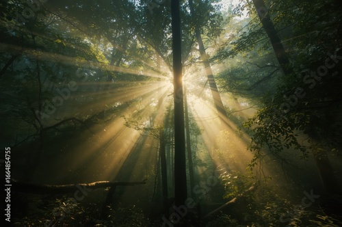 Surreal forest bathed in golden sunlight through gently swirling mist