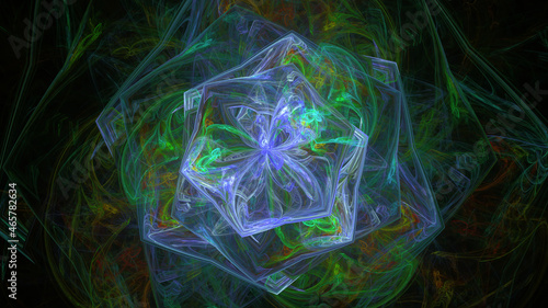 Surreal futuristic magic fractal image of green and blue crystal on black 4k
