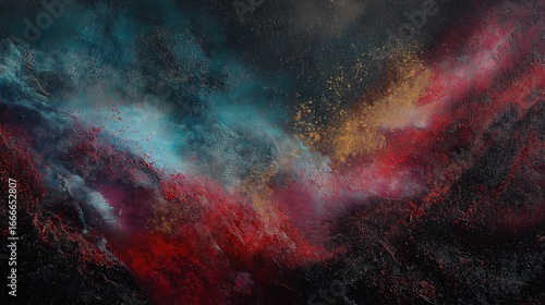 Surreal galactic painting with molten iron blues and reds, scattered eerie glows in black, orange, green, purple, ideal for digital art and astronomy visuals.