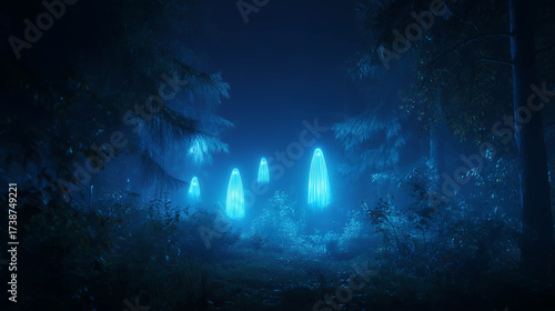 Surreal glowing blue ghostly figures in a forest at night, representing mystery, supernatural energy, and Halloween eeriness.