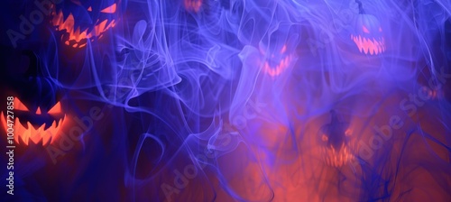 Surreal Halloween Abstract Design with Ghostly Apparitions and Faint Pumpkin Faces in Glowing Purple Fog