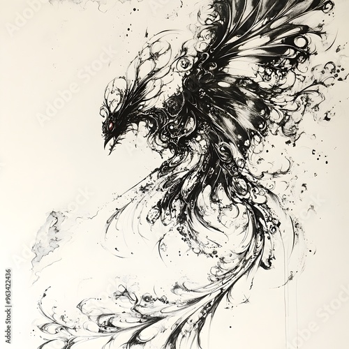 Surreal Ink Sketch of Mythical Winged Creature Set Against Abstract Backdrop