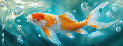 Surreal koi fish with crystal scales, swimming through a dreamlike, pastel-hued pond