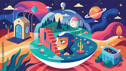 Surreal landscape featuring a unique blend of nature, architecture, and surreal figures under a cosmic sky