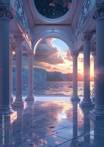 Surreal landscape with a colonnade and a view of the sea and mountains in the sunset