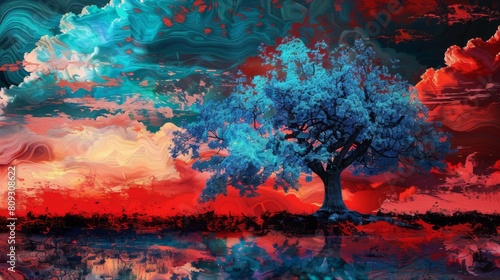 Surreal landscape with blue tree and red sky