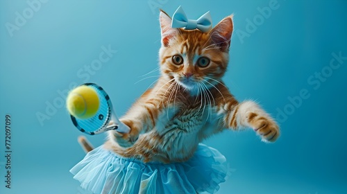 Surreal of an Orange Cat Playing Tennis on a Blue Background with Studio Lighting and Professional Capture
