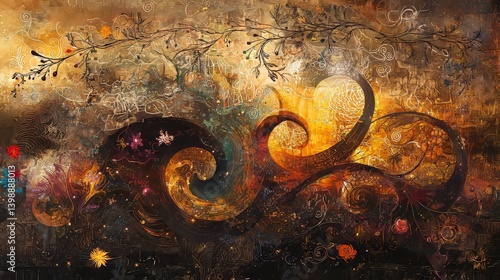 Surreal organic landscape with golden vines and abstract patterns